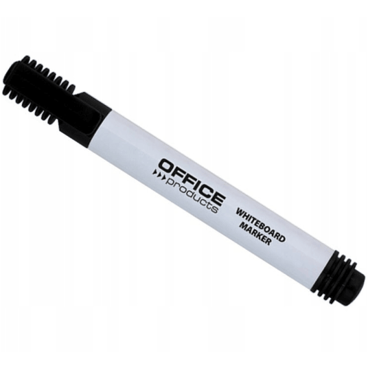 Marker do tablic OFFICE PRODUCT z okrągłą, fibrową końcówką zapewnia wyraźny, kontrastowy zapis na tablicach suchościeralnych w biurze, szkole i domu. Szybkoschnący tusz na bazie alkoholu ogranicza smużenie i pozwala komfortowo prowadzić prezentacje oraz szybkie notatki. Formuła jest nietoksyczna, wolna od ksylenu i toluenu, dzięki czemu sprawdza się w codziennym użytkowaniu. Zakres grubości linii 1–3 mm umożliwia pisanie zarówno nagłówków, jak i drobnych punktów. Biała obudowa dobrze leży w dłoni, a skuwka i końcówka w kolorze tuszu ułatwiają natychmiastową identyfikację. Rowkowana skuwka z klipsem ułatwia przenoszenie i zapobiega staczaniu się markera z blatu. Na korpusie nadrukowano kod katalogowy, EAN, producenta i kraj pochodzenia, co ułatwia ewidencję i zamówienia uzupełniające.