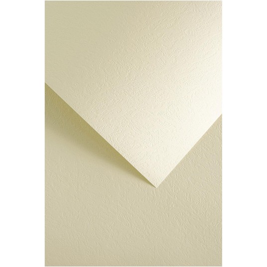 Zestaw 20 arkuszy ozdobnego kartonu o fakturze skóry i w kolorze kremowym. Przeznaczony do przygotowania insertów do kart okolicznościowych, dyplomów, zaproszeń, wizytówek, menu i innych eleganckich korespondencji.