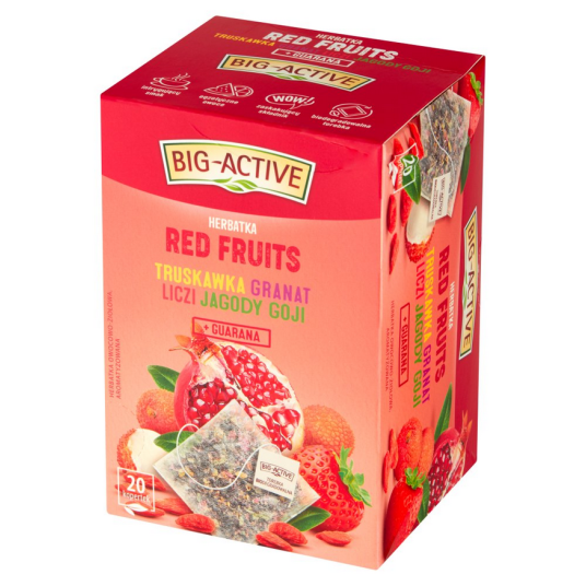 Herbata BIG-ACTIVE HOT DESIRE to wyjątkowa mieszanka owocowo-ziołowa, która łączy letnią słodycz truskawek z egzotyczną nutą liczi. Subtelna kwaskowatość jagód goji oraz delikatna słodycz granatu nadają naparowi głębi i charakteru. Dodatek guarany wnosi naturalną energię, czyniąc tę herbatę doskonałym wyborem na pełne wigoru rozpoczęcie dnia lub przyjemne uzupełnienie deseru.