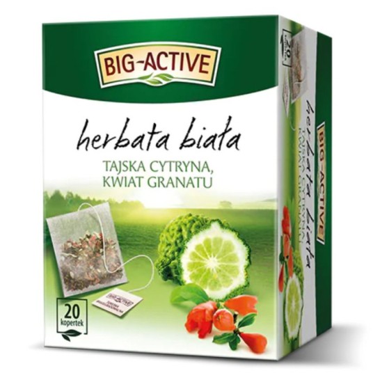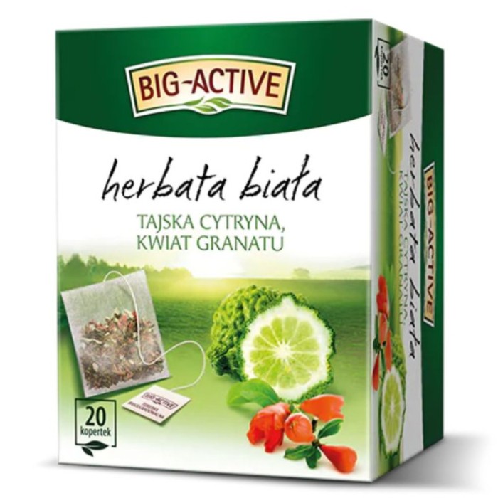 Herbata BIG-ACTIVE Biała z Tajską Cytryną to wyjątkowa propozycja klasy premium, stworzona dla osób ceniących subtelne, nietuzinkowe smaki. Jej bazą jest delikatna biała herbata (aż 80,3%), znana z wyrafinowanego, łagodnego aromatu. Kompozycję wzbogacono szlachetną, orientalną nutą tajskiej cytryny, która dodaje lekkości i orzeźwienia.
