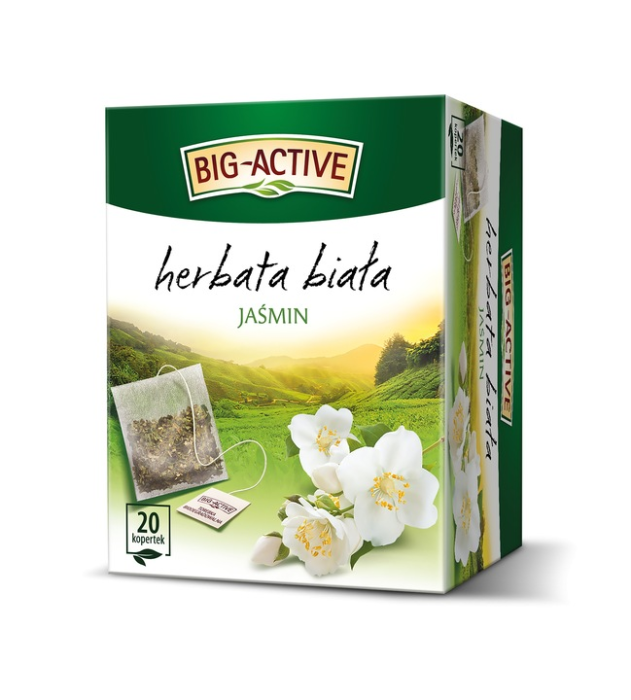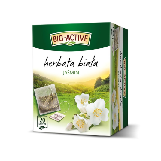 BIG-ACTIVE Biała Jaśmin to niezwykle wyrafinowana kompozycja, w której naturalna łagodność białej herbaty spotyka się z intrygującą nutą kwiatów jaśminu. To połączenie cenione od wieków – delikatny, jasny susz z wiosennych pąków liściastych krzewów herbacianych oraz aromatyczny jaśmin tworzą napar harmonijny, subtelny i pełen klasy.
