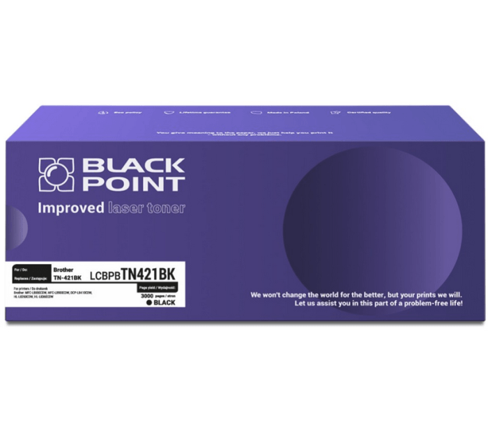 Toner Black Point LCBPBTN421BK to wysokiej jakości zamiennik przeznaczony do kolorowych drukarek laserowych Brother z serii biurowej. Został zaprojektowany jako pełnowartościowy odpowiednik oryginalnego tonera Brother TN-421BK, oferując bardzo dobrą jakość wydruków, stabilną pracę oraz korzystną relację ceny do wydajności.