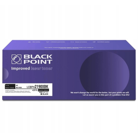 Toner Black Point do HP 219X (W2190X) w kolorze czarnym to wysokowydajny zamiennik stworzony z myślą o intensywnej eksploatacji w nowoczesnych biurach i firmach. Zapewnia wyraźny, głęboki czarny wydruk oraz stabilną, bezproblemową pracę od pierwszej do ostatniej strony. Dzięki zwiększonej pojemności pozwala wydrukować aż 4 200 stron, czyli nawet o 1 000 stron więcej niż oryginalny toner OEM, co przekłada się na realne oszczędności i rzadszą wymianę wkładów.