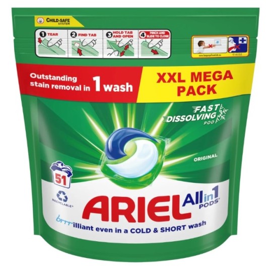 Kapsułki do prania Ariel mają inteligentną konstrukcję z wieloma przegródkami, dzięki której składniki są od siebie oddzielone, aż dotrą do prania. W kontakcie z wodą folia rozpuszcza się, uwalniając potężne technologie usuwania plam, zapewniając najgłębsze i najsilniejsze czyszczenie kolorów All-in-1 PODS. Co więcej, kapsułki do prania Ariel All-in-1 PODS są dostępne w opakowaniu nadającym się do recyklingu.