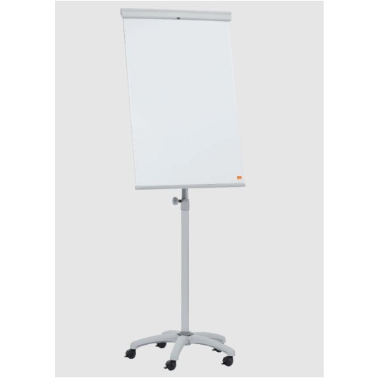Flipchart ze stalową magnetyczną tablicą suchościeralną umieszczony na ruchomej podstawie, ze zintegrowaną półką na markery. Mobilna podstawa ma regulowaną wysokość i kółka wyposażone w blokady zapewniające dodatkową stabilność. W komplecie haczyki do bloków Nobo oraz listwa ułatwiająca odrywanie kartek z zawieszonego bloku. Stalowa magnetyczna powierzchnia tablicy zapewnia wysoki poziom ścieralności przy umiarkowanym użytkowaniu.