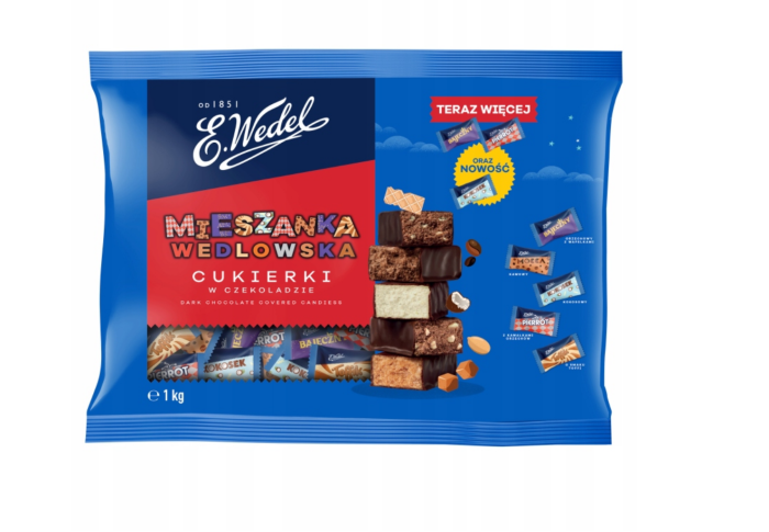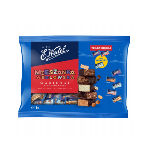 Mieszanka Wedlowska to bogactwo i różnorodność smaków, którym trudno się oprzeć! W każdej paczce znajdziesz kultowe cukierki oblane wedlowską czekoladą deserową (min. 47% masy kakaowej):